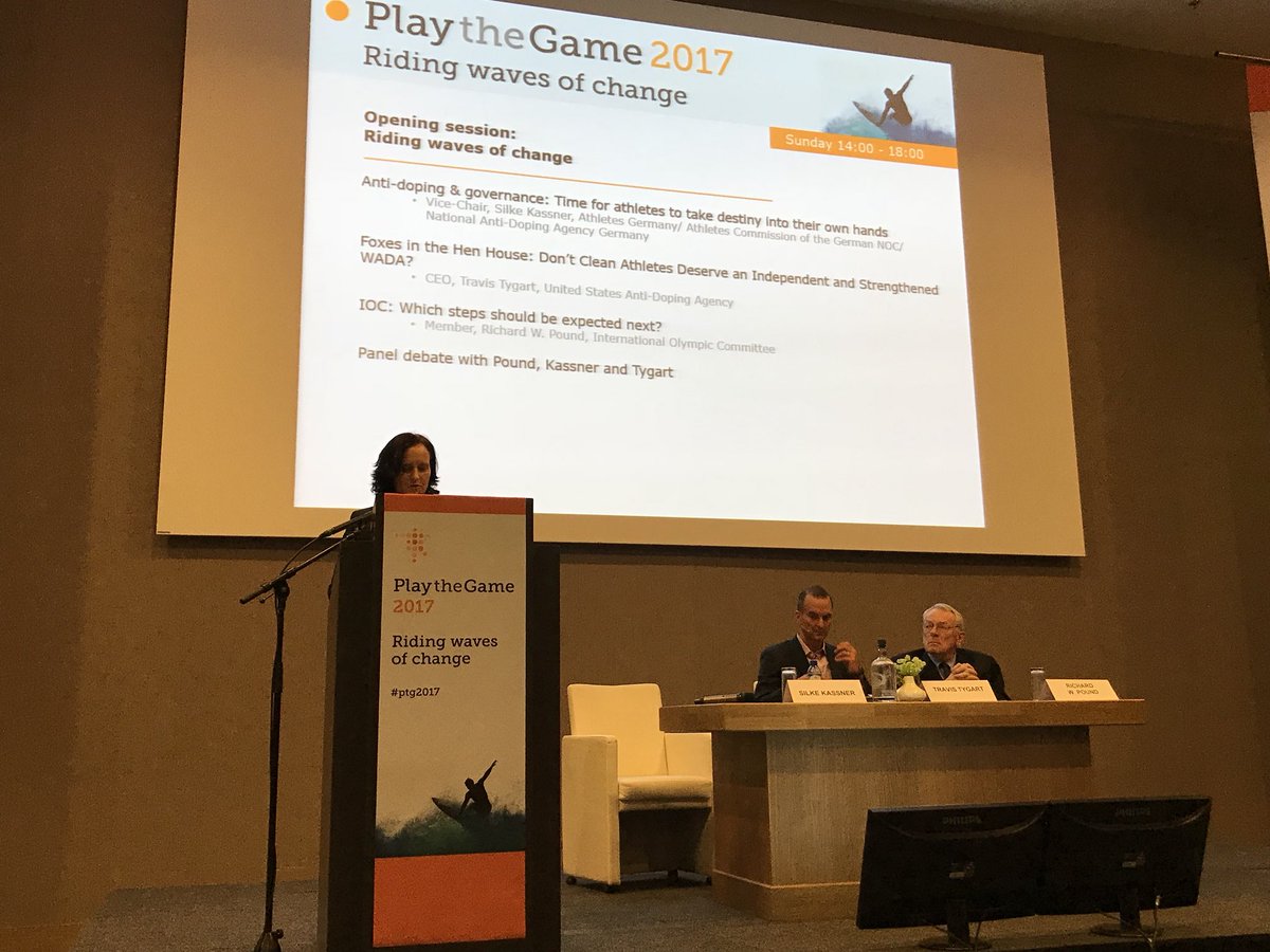 Yesterday at Play the Game 2017 I had the privilege of chairing the opening plenary panel that included Travis Tygart (USADA), Richard Pound (IOC) and Silke Kassner (vice-chair of the German Athletes Commission) -- seen above via @jensweinreich. During our discussion Dick Pound said of the leadership of international sports federations: "Nothing scares these old folks as much as athletes getting organised - so don’t [athletes] stop doing that."